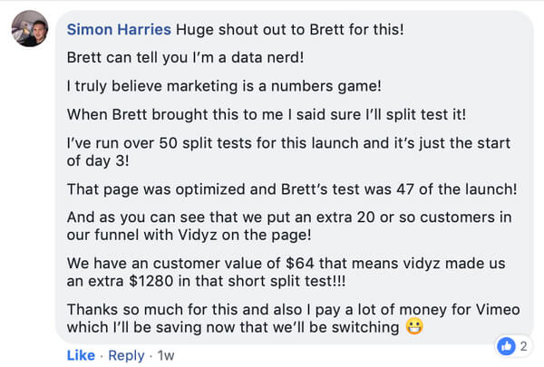 Luke Maguire and Simon Harries split-tested using Vidyz on their $300k Storymate launch. Vidyz outperformed Vimeo by 30%.
